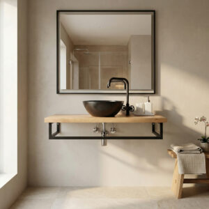 A refined showcase of natural textures, featuring a thick travertine slab on seamless oak plywood. Its handleless, floating design emphasizes a clean linear aesthetic and premium material purity. |