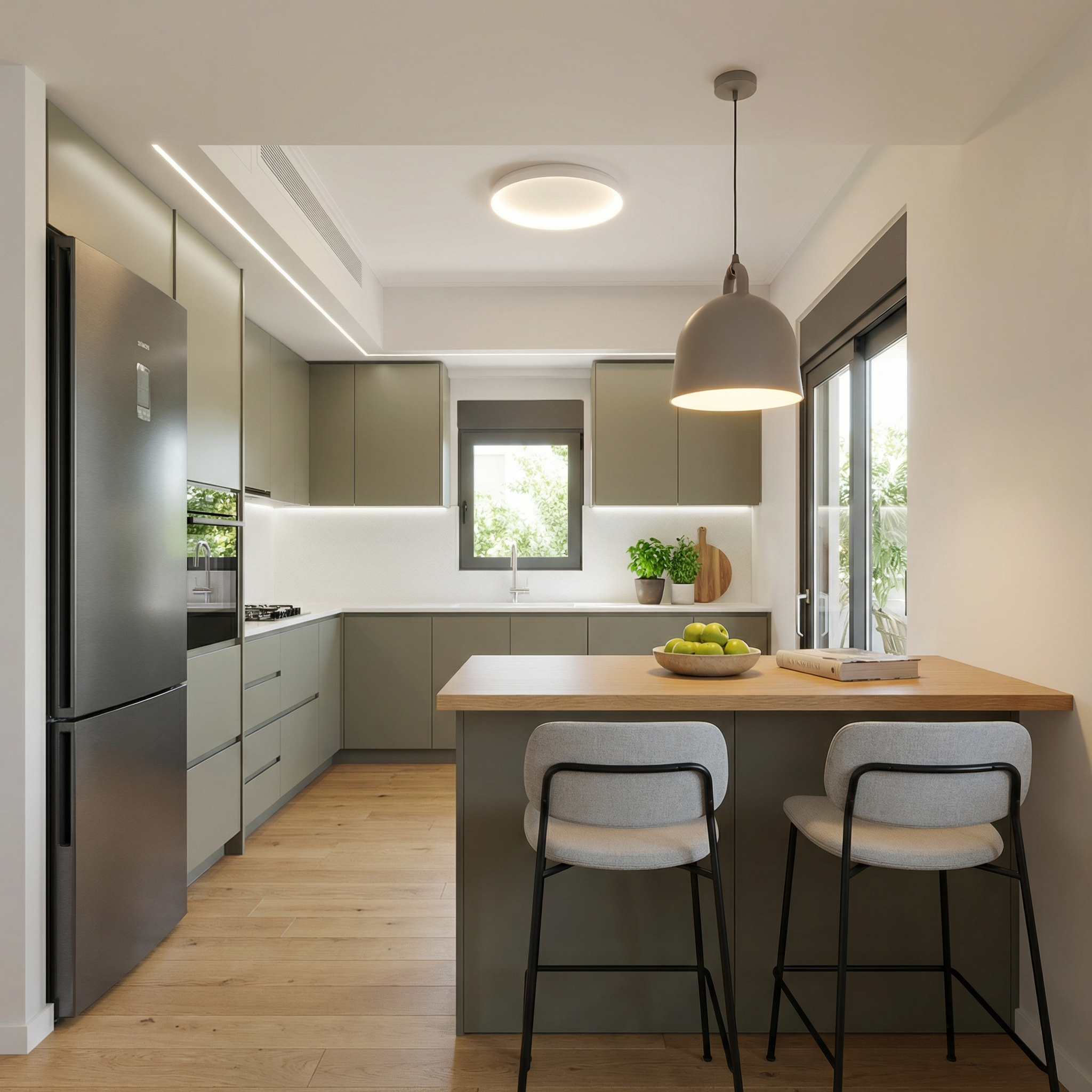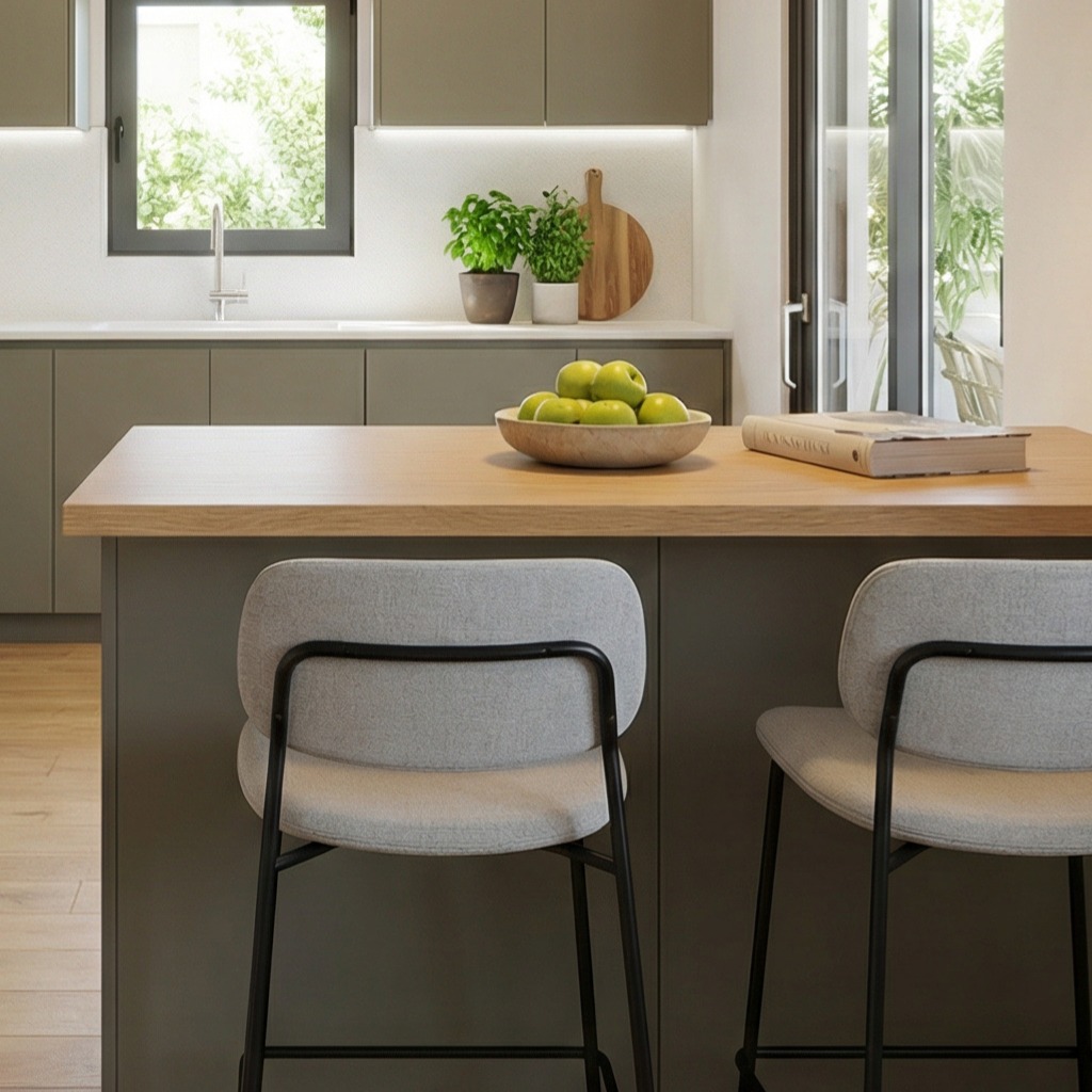 | Περιγραφή | Featuring premium PET matte cabinetry in a warm greige tone, seamlessly paired with a natural oak breakfast island. |