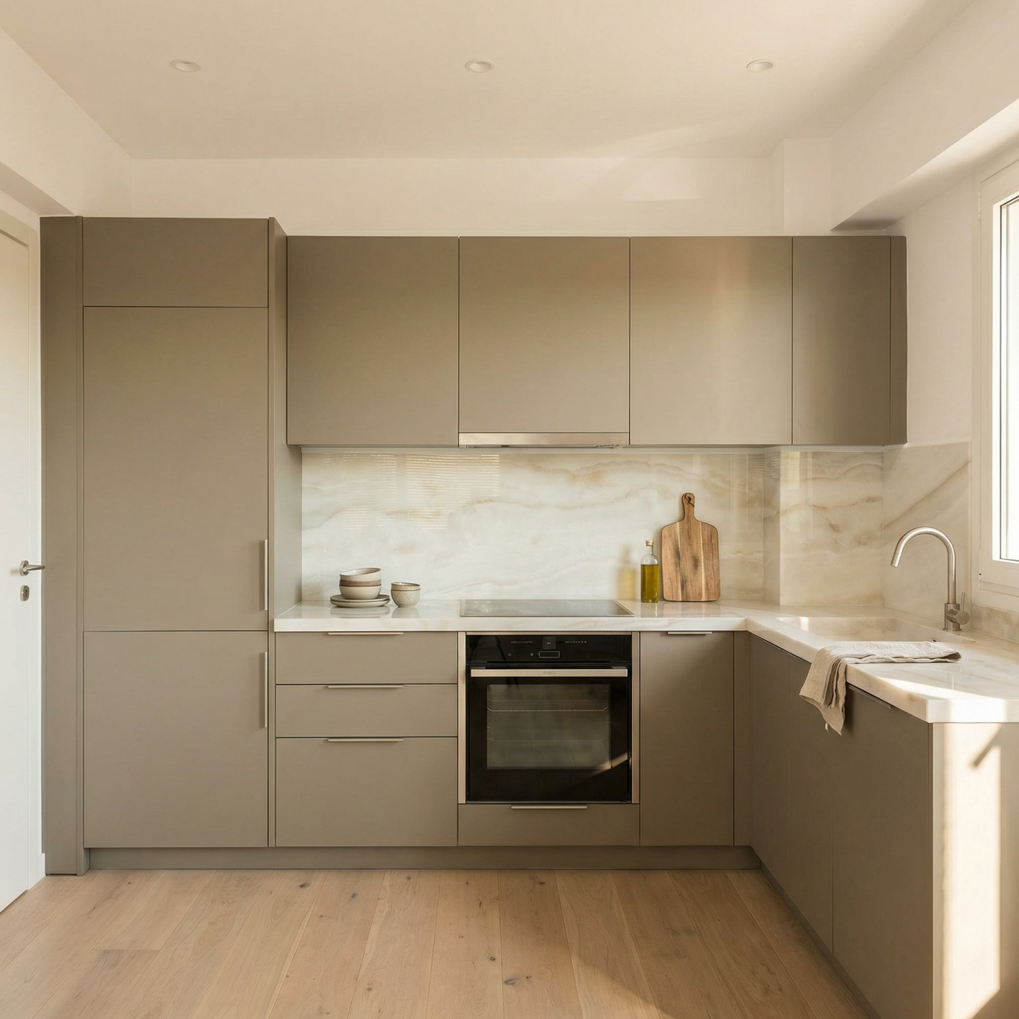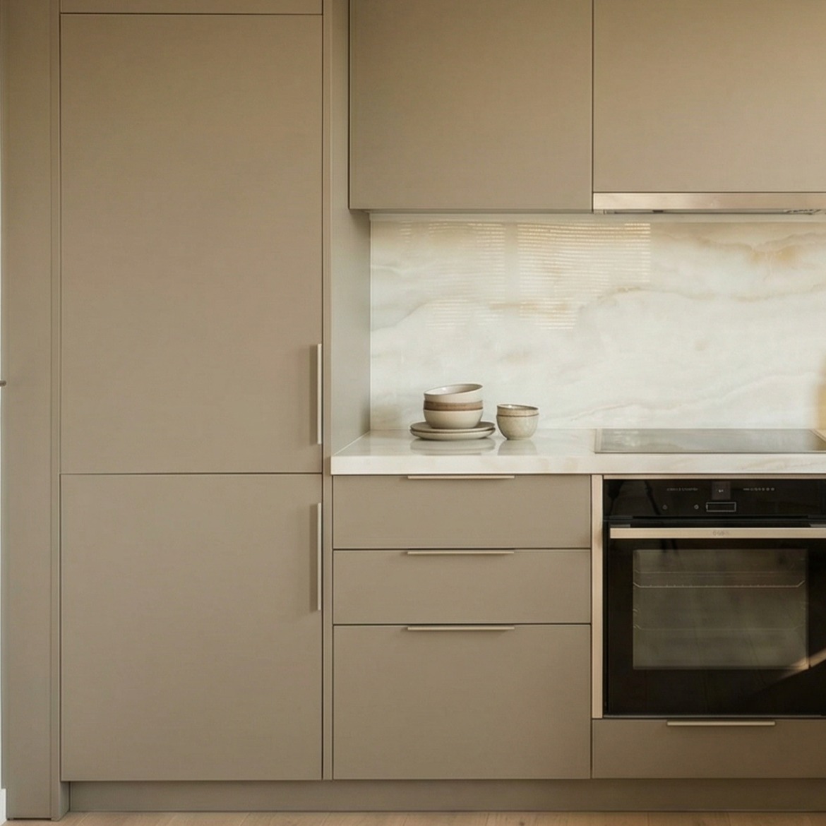 ΠεριγραφήA refined kitchen featuring HPL Soft Touch cabinetry in khaki, paired with a striking marble-veined backsplash. The sleek horizontal handles and high-durability surfaces create a balanced, high-end result where technology meets natural aesthetics.