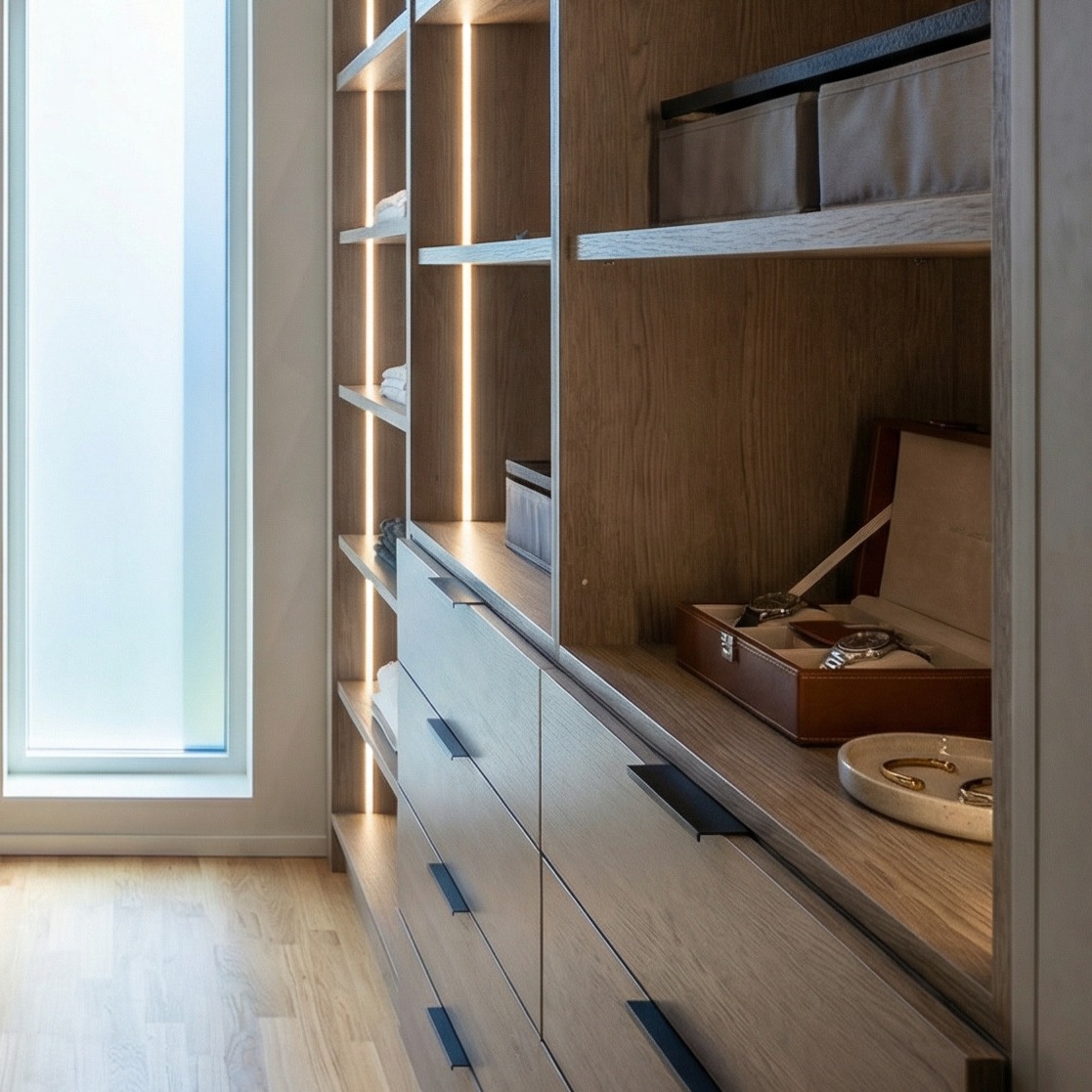| Περιγραφή | Optimized for maximum efficiency, this system features a symmetrical array of open shelving and wide, integrated drawers. The layout provides a dedicated spot for every garment, ensuring your collection stays perfectly structured and accessible. |
