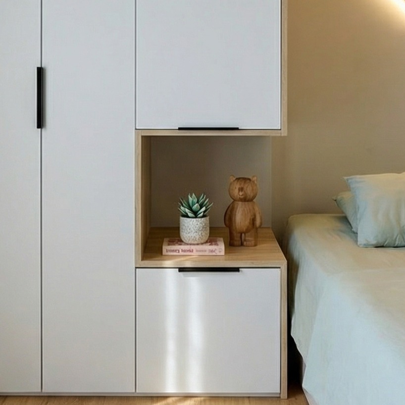 ΠεριγραφήThis floor-to-ceiling wardrobe integrates a functional bedside niche and a lower storage cabinet into a single, seamless unit. Its minimalist white panels and streamlined vertical handles maximize floor space while maintaining a clean, organized look.