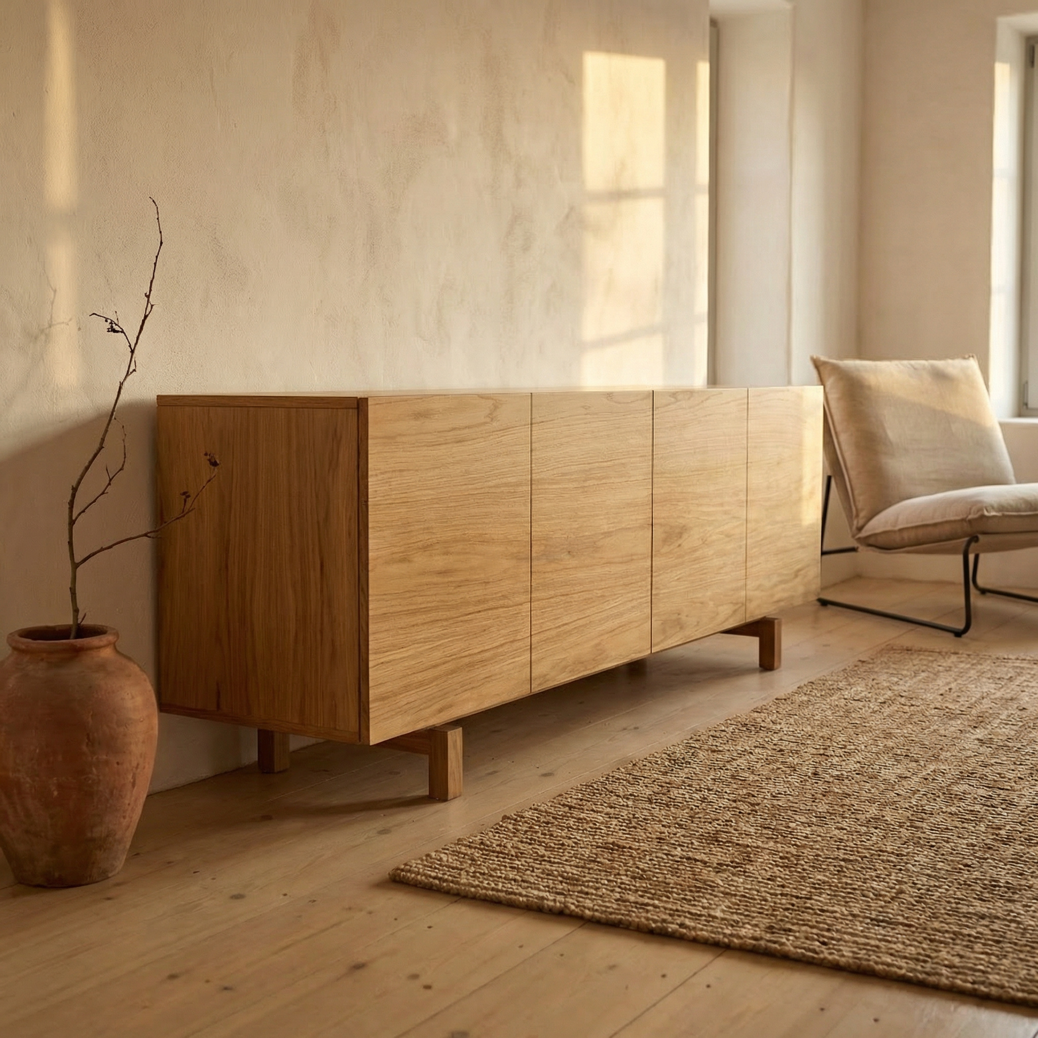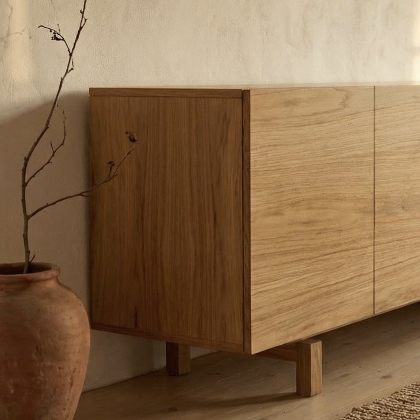 | Περιγραφή | Buffet Δρύς Φαρδύβενο Λουστραριστό, Πόδια από Μασίφ Δρύς Varnished Wide-Plank Oak with Solid Oak Legs |