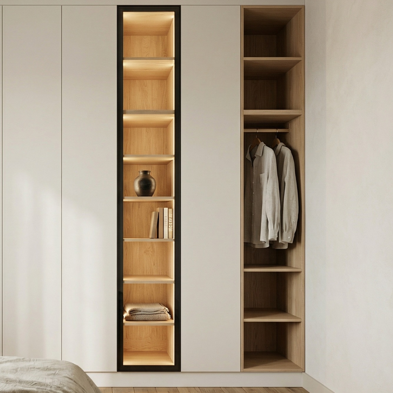 | Περιγραφή | A seamless, floor-to-ceiling design that perfectly balances hidden storage with a warm, illuminated wooden niche. This clever interplay of light and solid surfaces turns a practical wardrobe into a stunning room feature. |
