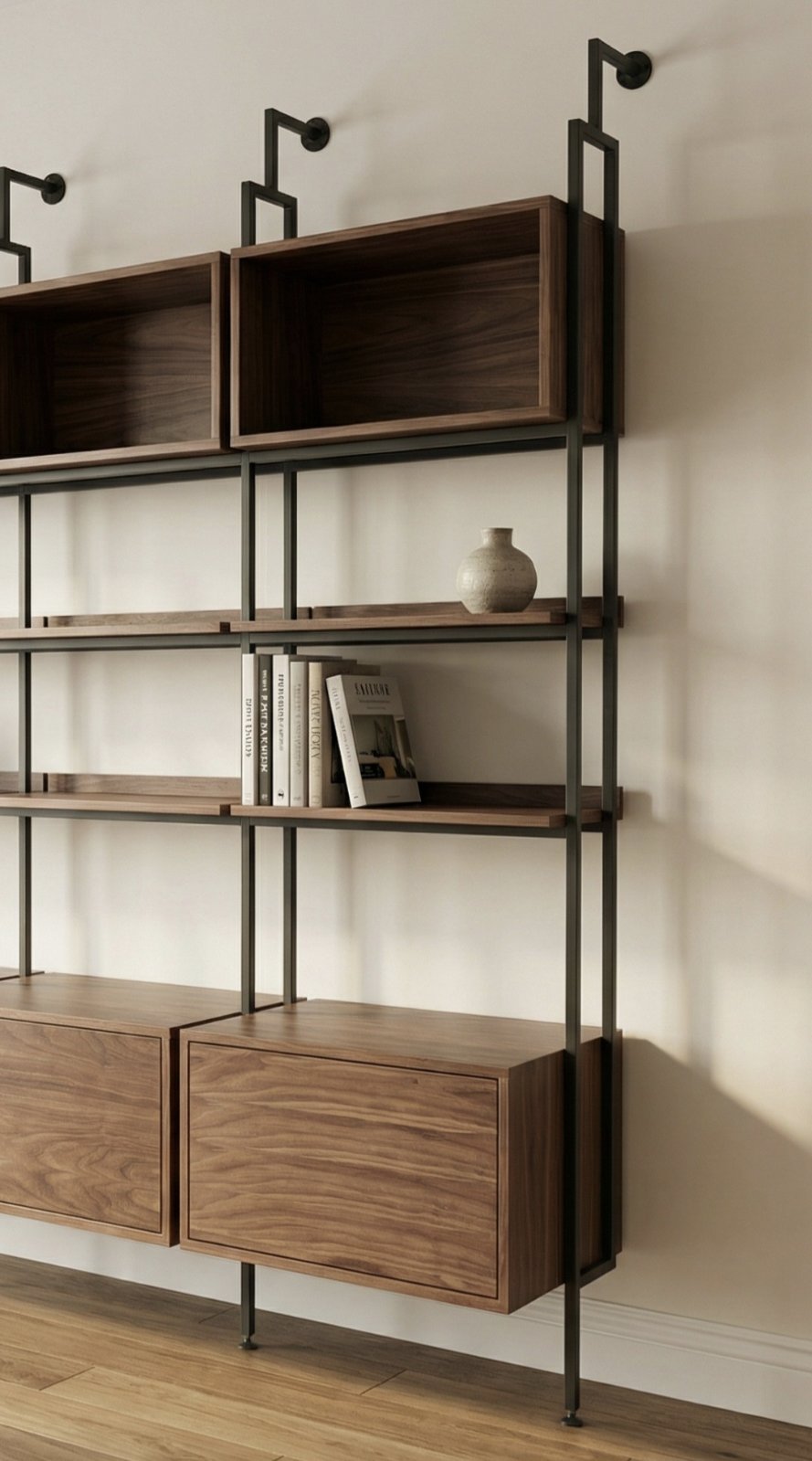 The Beam Bookshelf defines industrial elegance through its slender metal frame and solid wooden volumes.