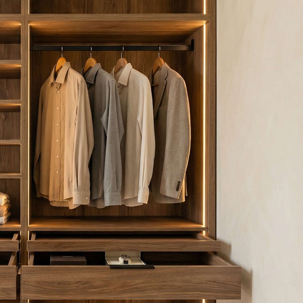 ΠεριγραφήBring the luxury of a high-end retail gallery into your home. This professional-grade dressing system uses integrated spotlighting and an open-display layout to showcase your collection like a curated fashion exhibit.