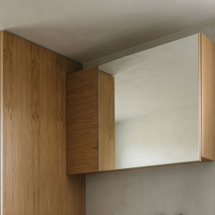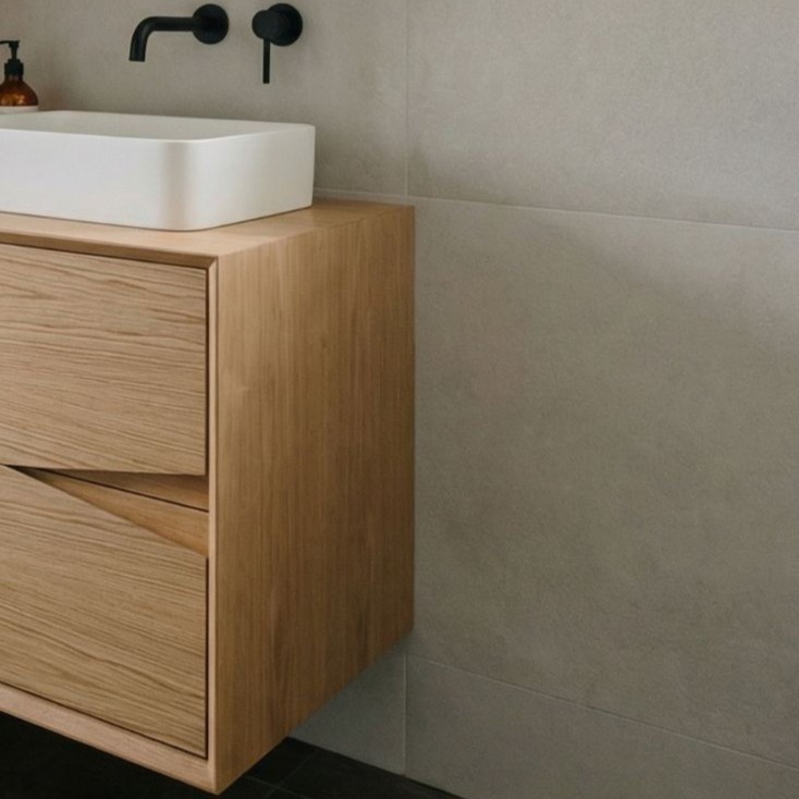 Defined by its striking angular recessed handles, this vanity showcases a unique geometric dialogue within its oak plywood facade.