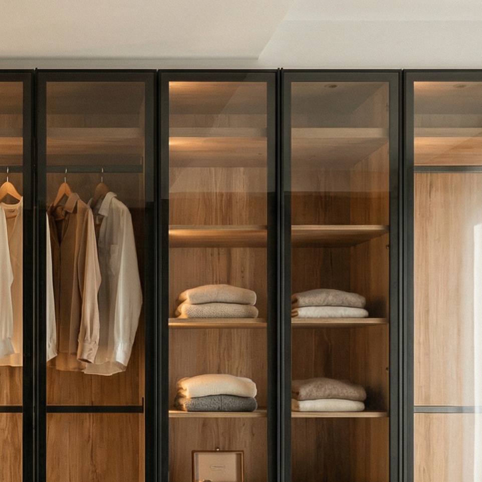 ΠεριγραφήThis high-end dressing room features elegant glass-front doors with slim black frames that transform your wardrobe into a private gallery.