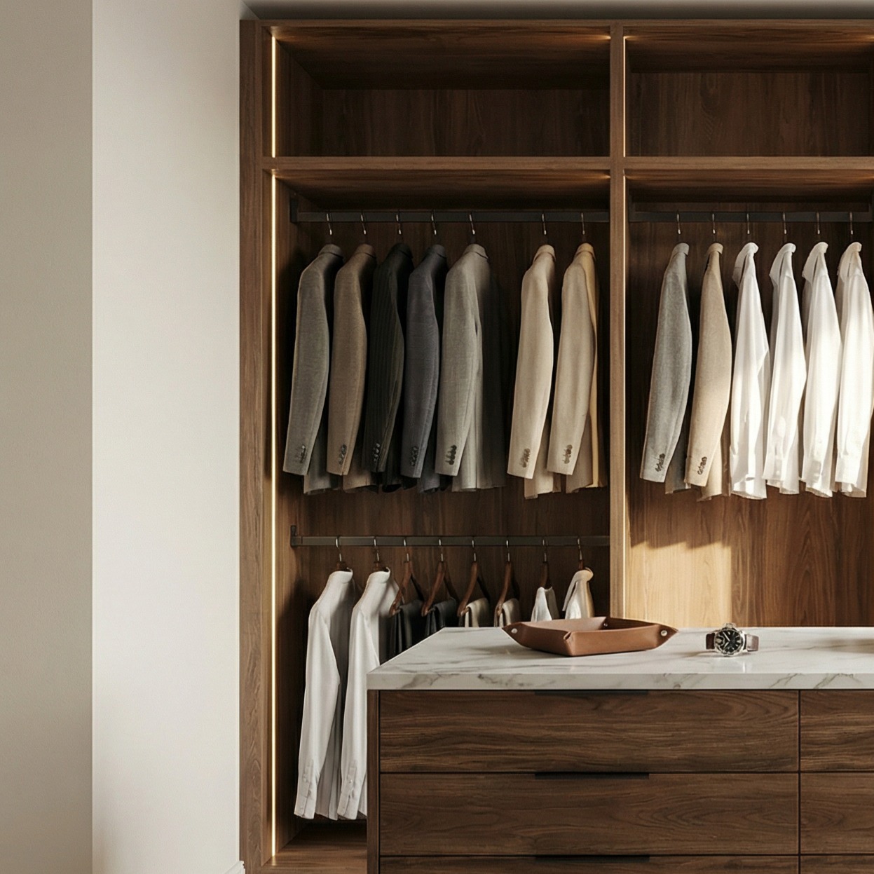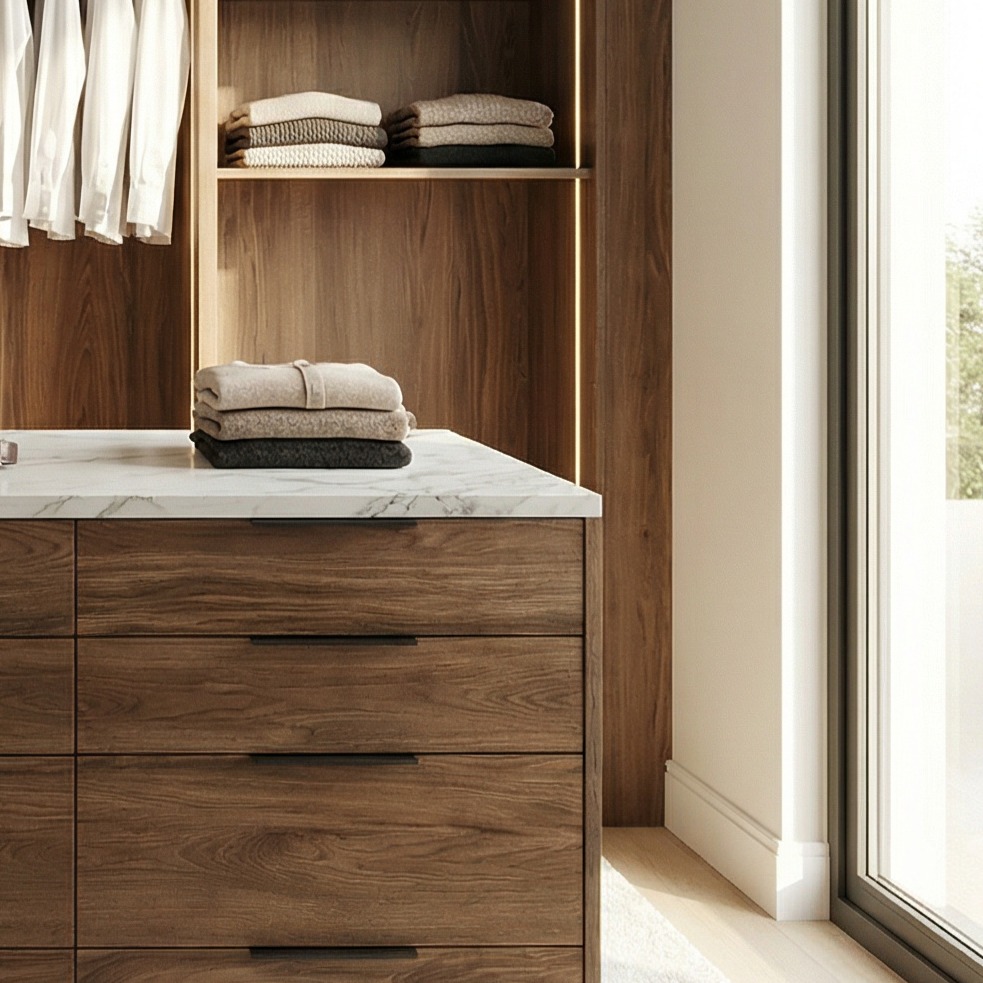 | Περιγραφή | A striking balance of natural stone and deep wood tones. The central marble-top island serves as the heart of this showroom-style dressing room, providing a premium, high-functioning space for accessory organization. |