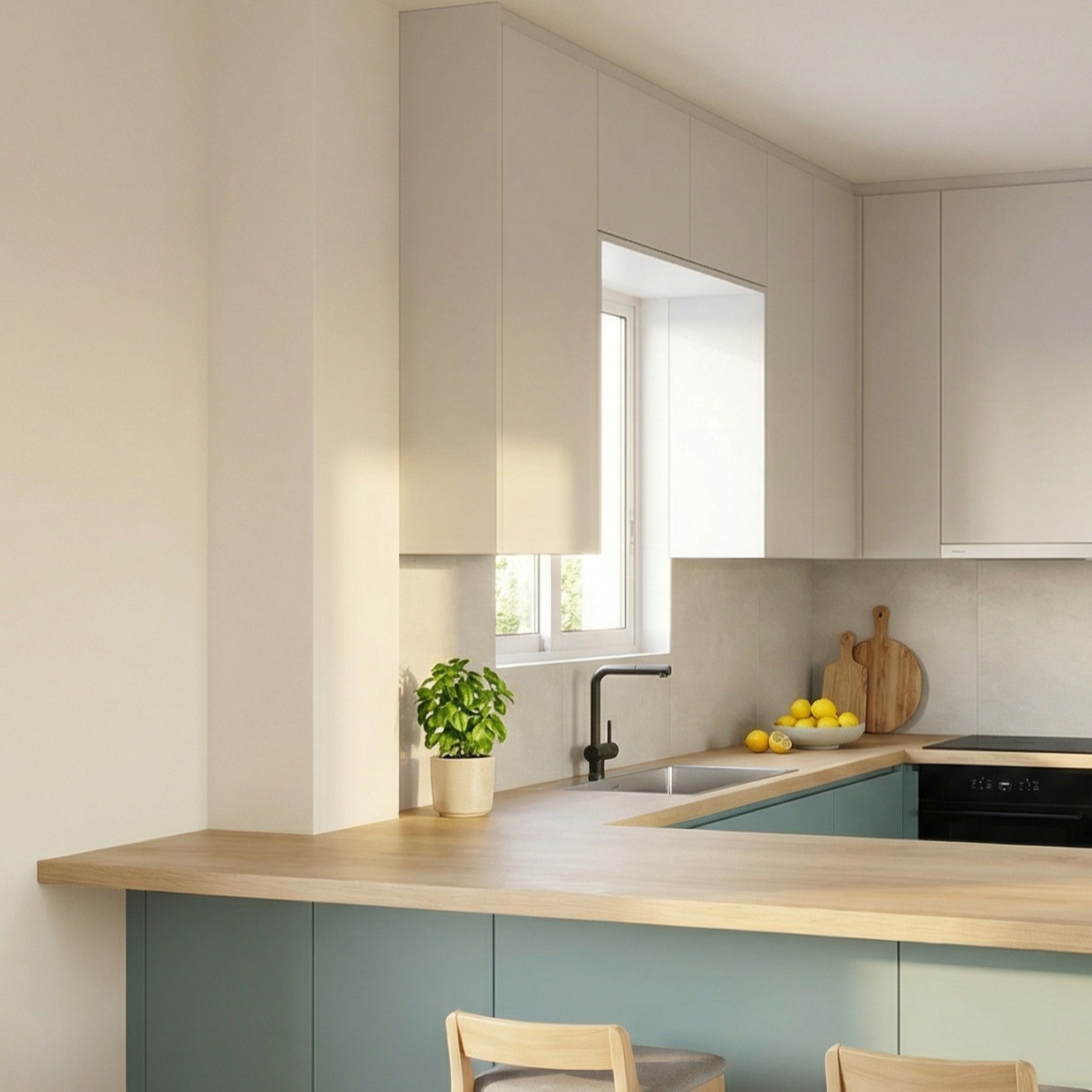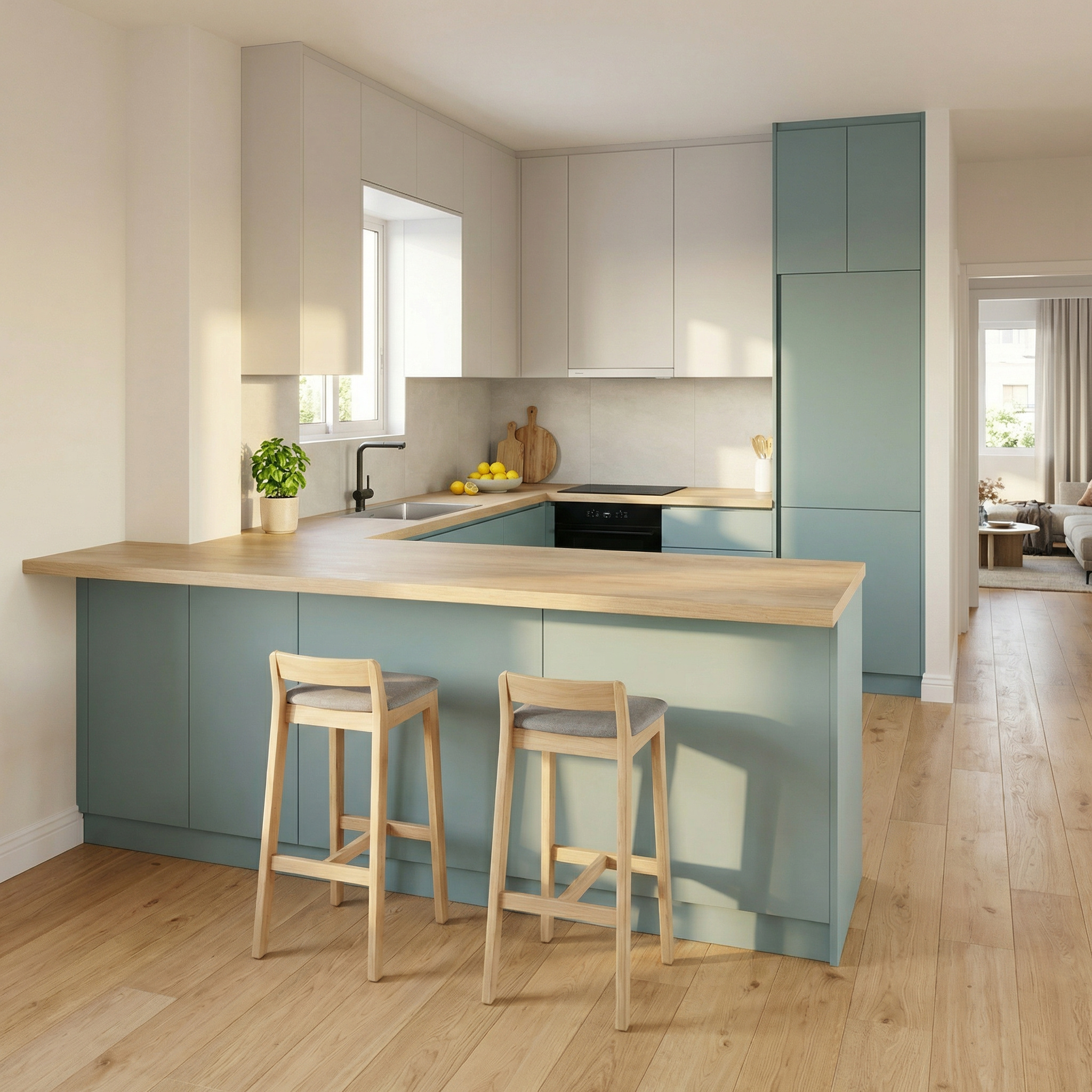 ΠεριγραφήA refined kitchen design where clean, structural lines meet the unique depth of Nordic Teal. The natural wood-finish countertop provides a calculated contrast to the matte cabinetry, enhancing the high-end, architectural aesthetic. A minimalist space built on precision, functionalism, and visual clarity.