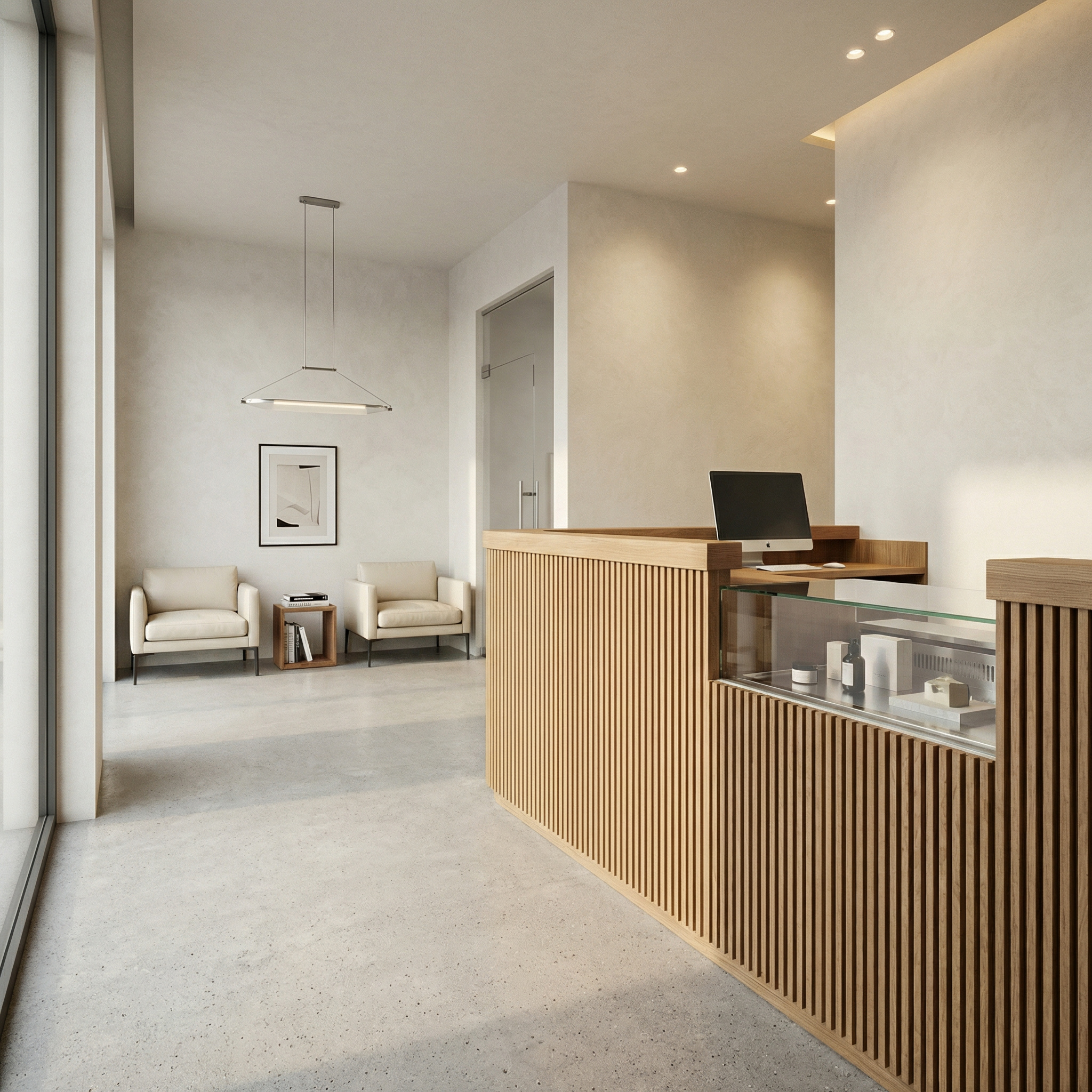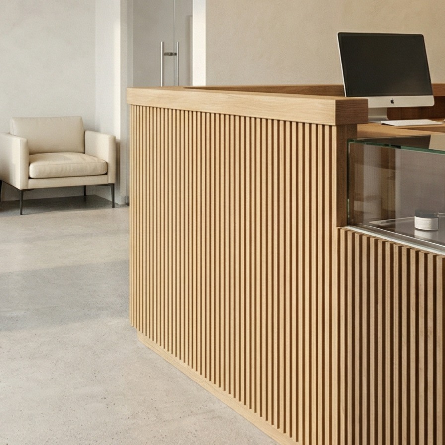 The Ribbon Reception features a repeating wooden facade that brings warmth and a sense of movement to your entrance. |