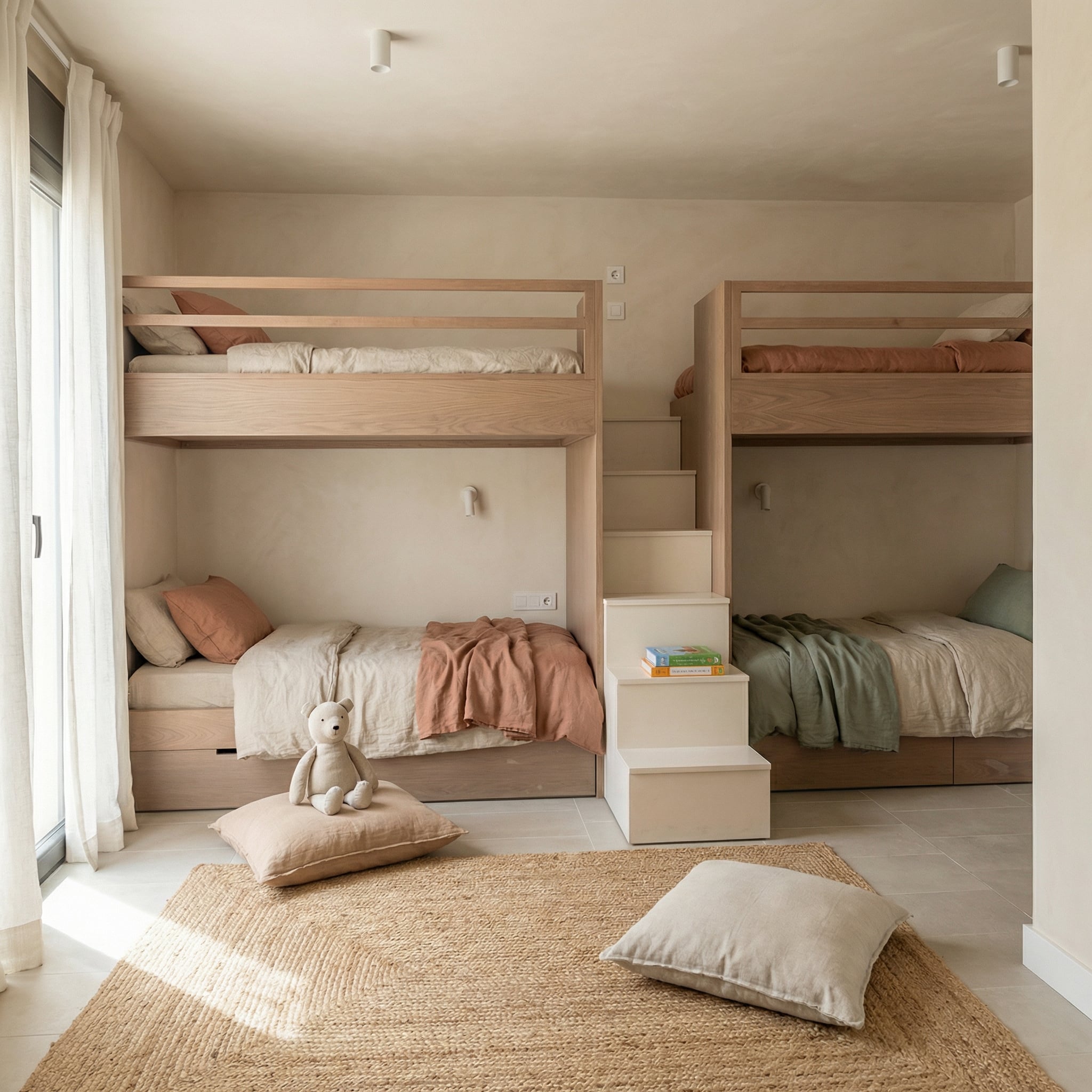 ΠεριγραφήA smart, space-saving solution that turns a shared bedroom into a functional retreat. This elevated bunk system features wide, integrated steps for safe access and built-in under-bed storage.