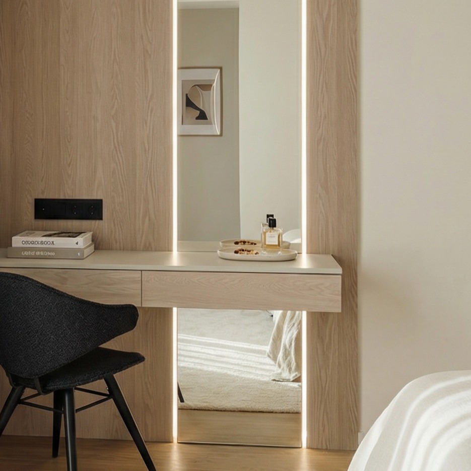 A multi-functional oak sanctuary designed for moments of personal care and quiet reflection. Integrating floor-to-ceiling shelving with a full-length backlit mirror, it creates a harmonious corner of warmth and linear light.