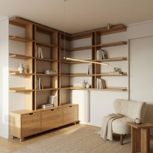 This set features a low-profile frame and a signature linear headboard. The structure is defined by its inset block-leg design, creating a subtle recessed foundation. It is a study in tactile minimalism. |