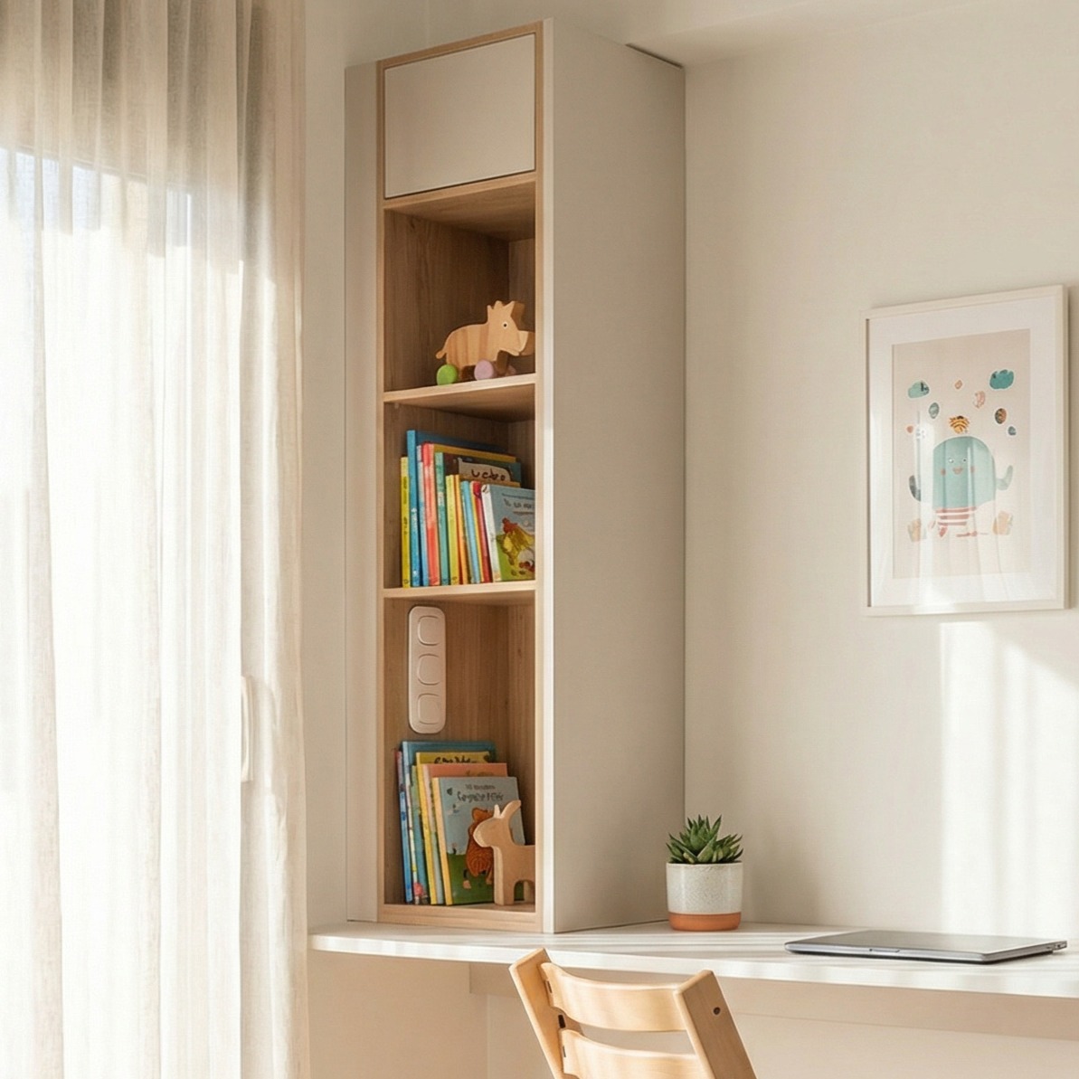 | Περιγραφή | A streamlined workspace that elevates the modern children’s room. The Study-Tower Desk features a long, floating-style surface paired with an integrated vertical shelving unit. Finished with oak-textured drawers, it perfectly balances clean aesthetics with warm, practical storage. |