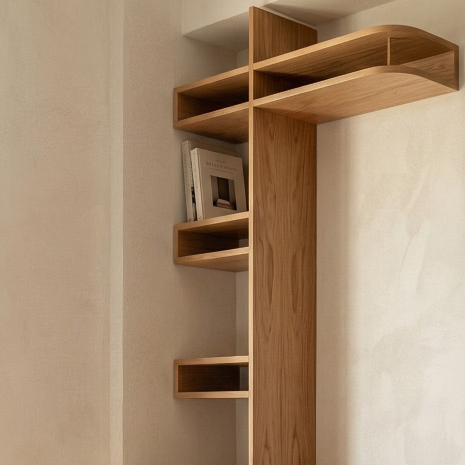 A design defined by sharp verticality and the soft, fluid radius of the drawer. This oak-crafted piece merges structured shelving with a gentle, sweeping curve for a balanced, organic feel.